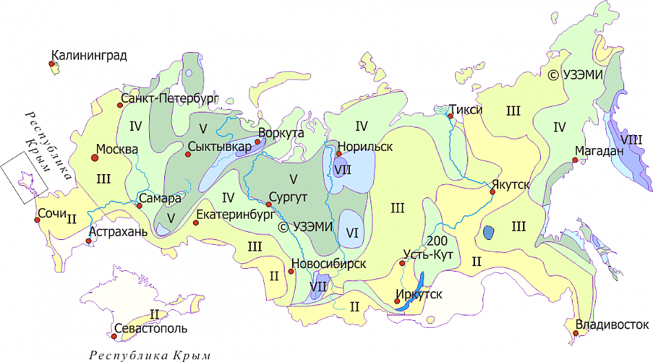 Свод правил устанавливает районирование РФ по весу снегового покрова, условно разделяя территорию страны на 8 снеговых зон, для каждой из которых установлено нормативное значение веса снеговых нагрузок.