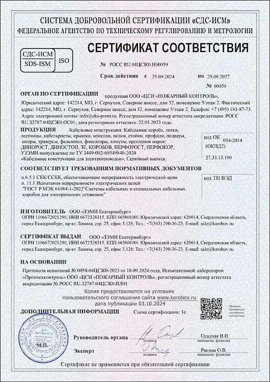 Уважаемые коллеги, кабельные конструкции марки ЗЕ прошли сертификационные испытания, по результатам которых получен сертификат на непрерывность электрической цепи кабельных коробов.