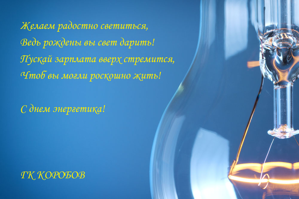 Уважаемые коллеги, сердечно поздравляем Вас с профессиональным праздником - днем энергетика, желаем успехов в нашей нелегкой и ответственной работе по обеспечению бесперебойного электроснабжения!